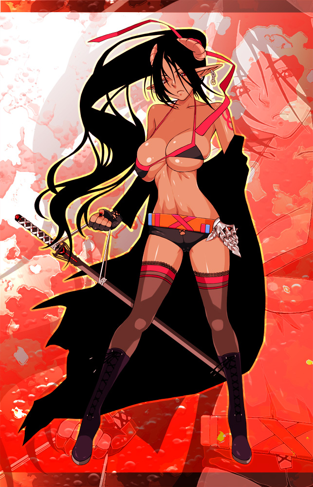 1girlbikinibikini top onlyblack hairbootsbreastsearringsfemale focusgauntletshornshuge breastsjewelrykatanalarge breastslong hairpointy earssoloswimsuitswordthighhighsundersized clothesweaponzoom layer