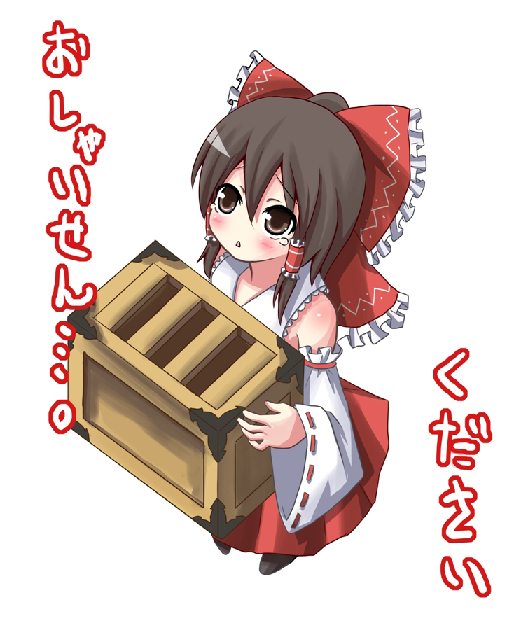 1girlblack eyesblack hairbowboxdetached sleevesdonation boxfemale focusfull bodyjapanese clothesmikosimple backgroundsolotearswhite background