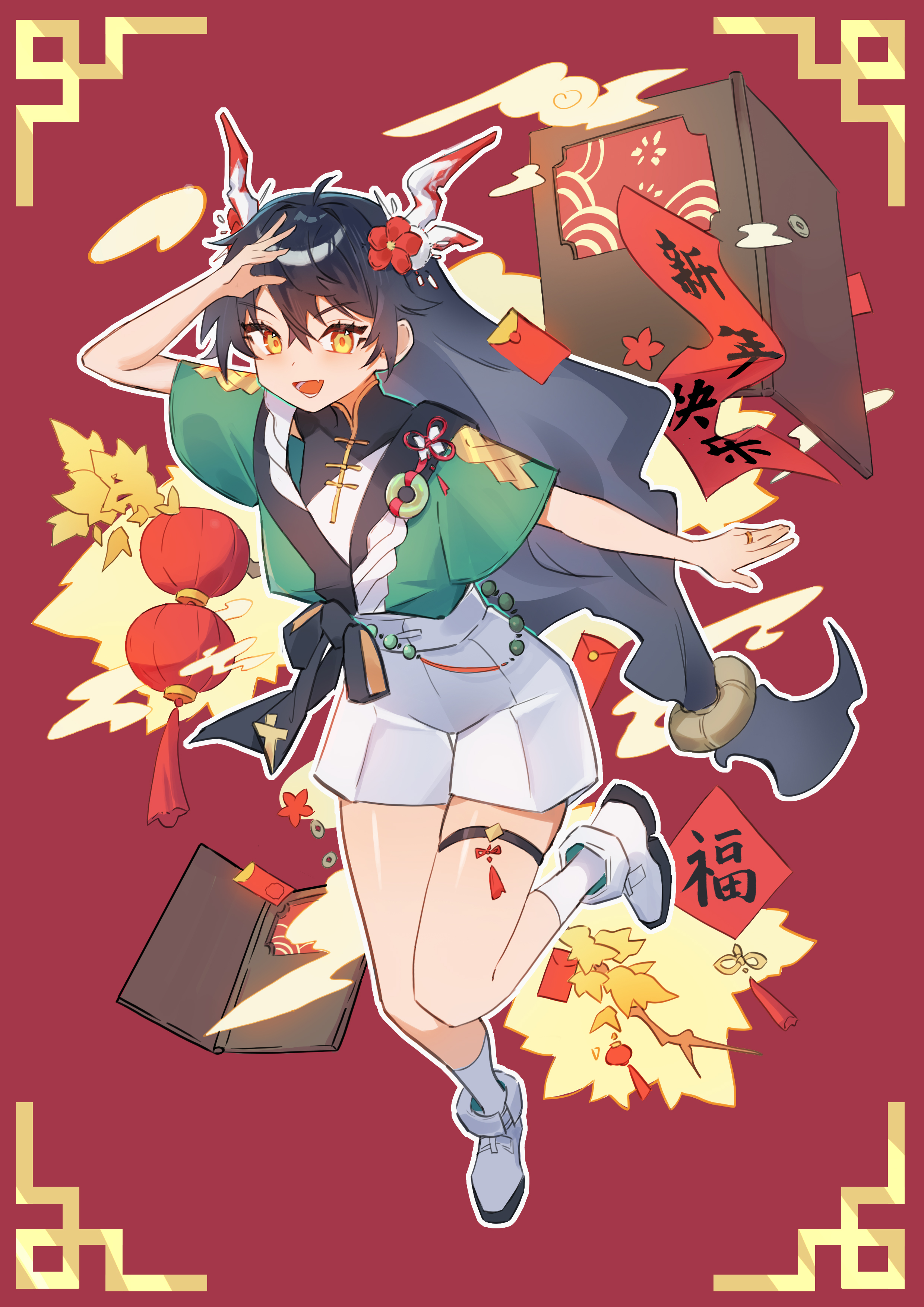 1girlarm upblack hairchinese clothesdragon girldragon hornsfangflowerfull bodyhair between eyeshair flowerhair ornamenthornslong hairlooking at vieweropen mouthred backgroundred flowershoesshort shortsshort sleevesshortsskin fangsmilesolothigh strapwhite shoeswhite shortsyellow eyes