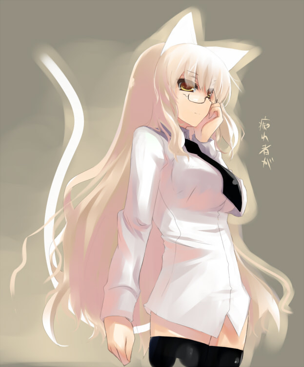 animal earsblonde hairbottomlessbrown eyescat earscat taildress shirtglasseslong hairnecktieshirtsolotailthighhighs