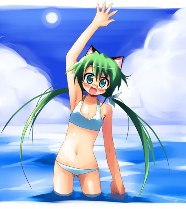 :d1girlanimal earsarm uparmpitsbikiniblushblush stickerscat earsdayfemale focusglassesgreen hairlong hairnavelopen mouthribbonsmilesoloswimsuittwintailswadingwaterwavingwhite bikini