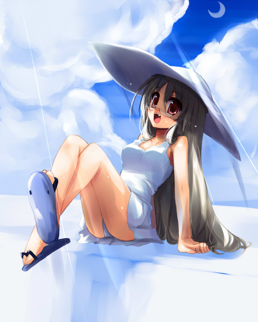 :d1girlblushcloudcrescent moondaydressfangfemale focusflip-flopshatlight rayslong hairmoonopen mouthred eyessandalssittingsmilesolosun hatsunbeamsundresssunlightvery long hairwhite dress