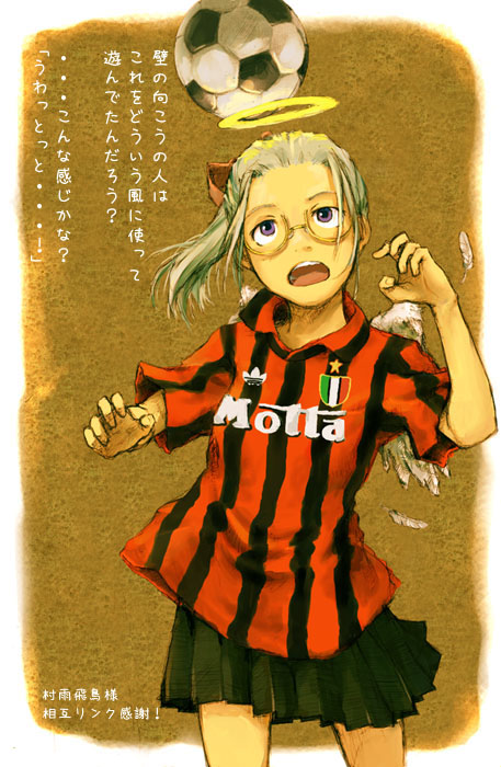 00s1girlballclothes writingfeathersfemale focusglasseshaloplaying sportspurple eyesskirtsoccersoccer ballsolotelstartraditional halowings