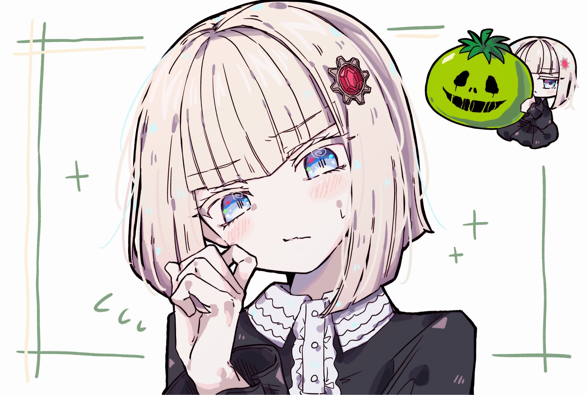 1girlblack shirtblonde hairblue eyeschibichibi insetflying sweatdropsgemgem hair ornamenthair ornamenthand upholdingholding masklight blushlooking at viewermaskokura 0915red gemstoneshirtshort hairsimple backgroundunworn maskupper bodywhite background