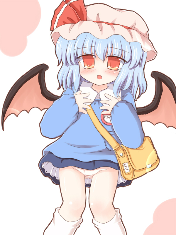 1girlbagblushdemon wingsfemale focushatkindergartenkindergarten uniformminiskirtmob capname tagpantiespantyshotred eyesschool bagskirtsolounderwearwings