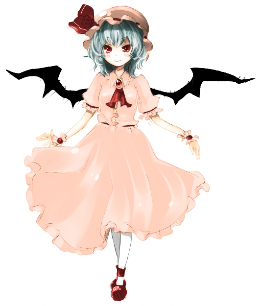 1girlascotbat wingsblushbroochfemale focusfull bodygemhatjewelrylooking at viewermary janesmob capred eyesshoessimple backgroundsolostandingvampirewhite backgroundwings