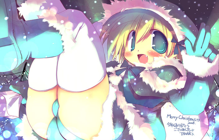 1girl2008aqua eyesassblonde hairblushbootschristmasfangfemale focuspantiessanta costumeshort hairsnowsolothighhighsunderwear