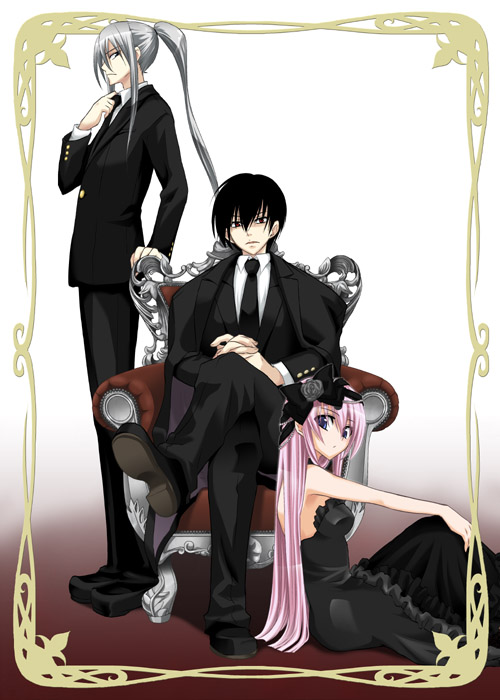 1girl2boysarmchairarmpitsblack dressblack flowerblack hairblack roseblue eyesbowchaircrossed legsdressflowerformal clotheshair bowkitagawa kazumalolita fashionlong hairlooking backmale focusmultiple boysnecktieon chairon floorown hands claspedown hands togetherpink hairponytailred eyesroseshort hairsittingstandingsuitvery long hair