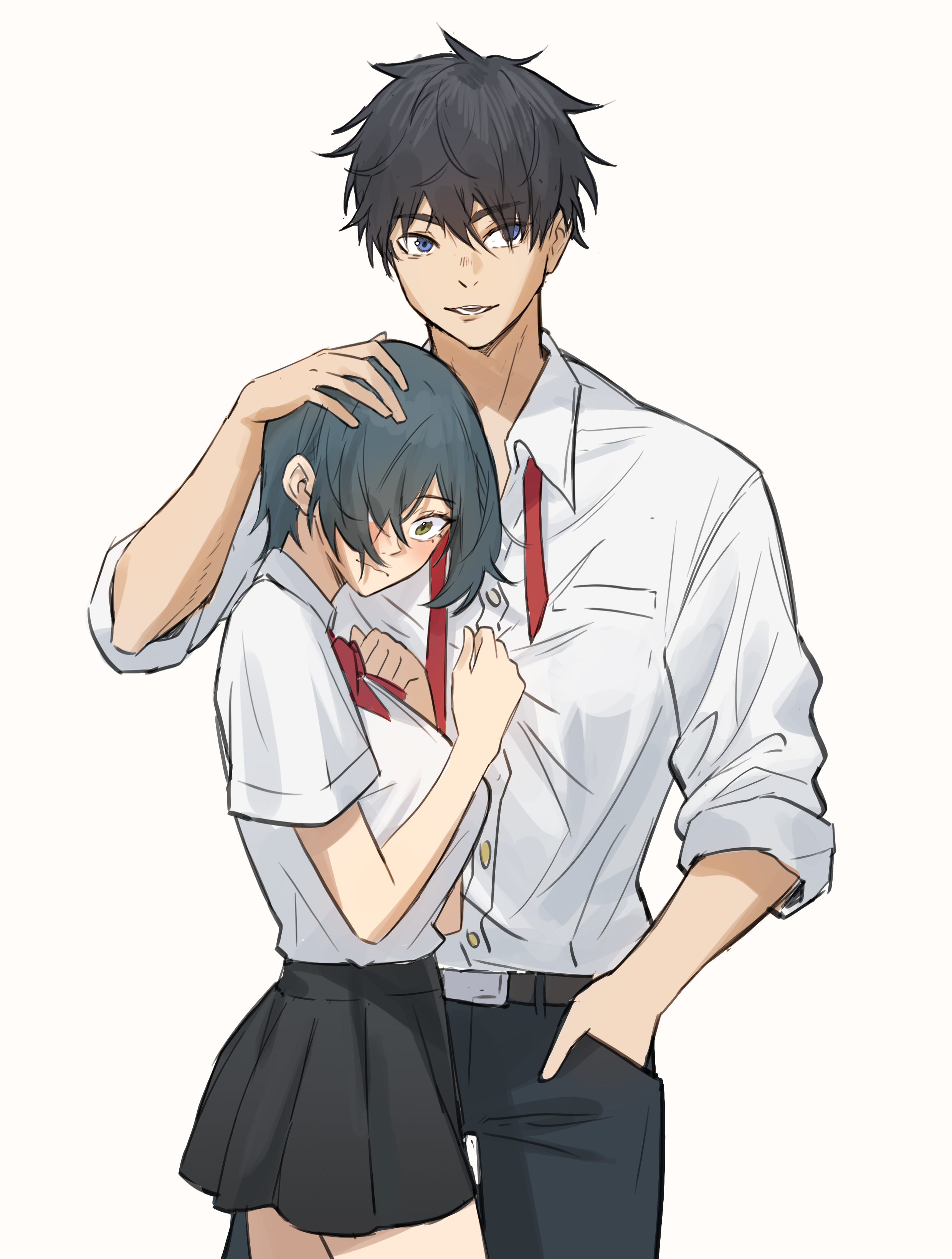 1boy1girlblack hairblack pantsblack skirtblue eyesblue hairblushbowbowtiebreastschoppy bangsclosed mouthcollared shirtcowboy shotgreen eyeshair over one eyehand in pockethand on another's headlarge breastslooking to the sideminiskirtnecktieopen mouthpantsparted bangspleated skirtred bowred bowtiered necktieshirtshirt tucked inshort hairshort sleevessimple backgroundskirtsmileundone necktiewhite backgroundwhite shirt