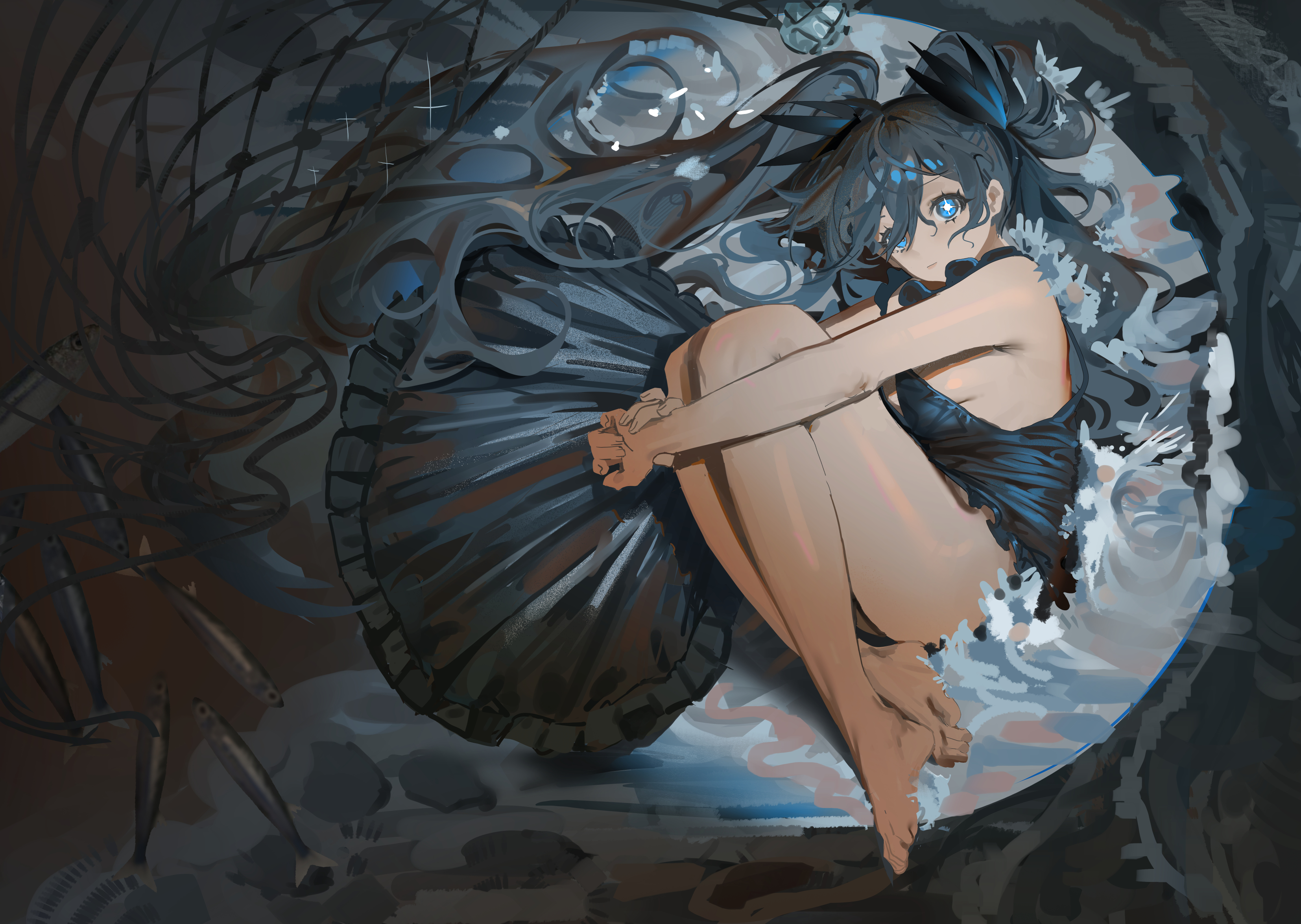 1girlbare armsbare legsbarefootblack dressblue eyesblue hairbowbreastsclosed mouthdressfeetfetal positionfull bodyhair bowhugging own legslong hairlooking at viewerlyingmedium breastson sidesideboobsleevelesssleeveless dresssolosymbol-shaped pupilstwintailsvery long hair