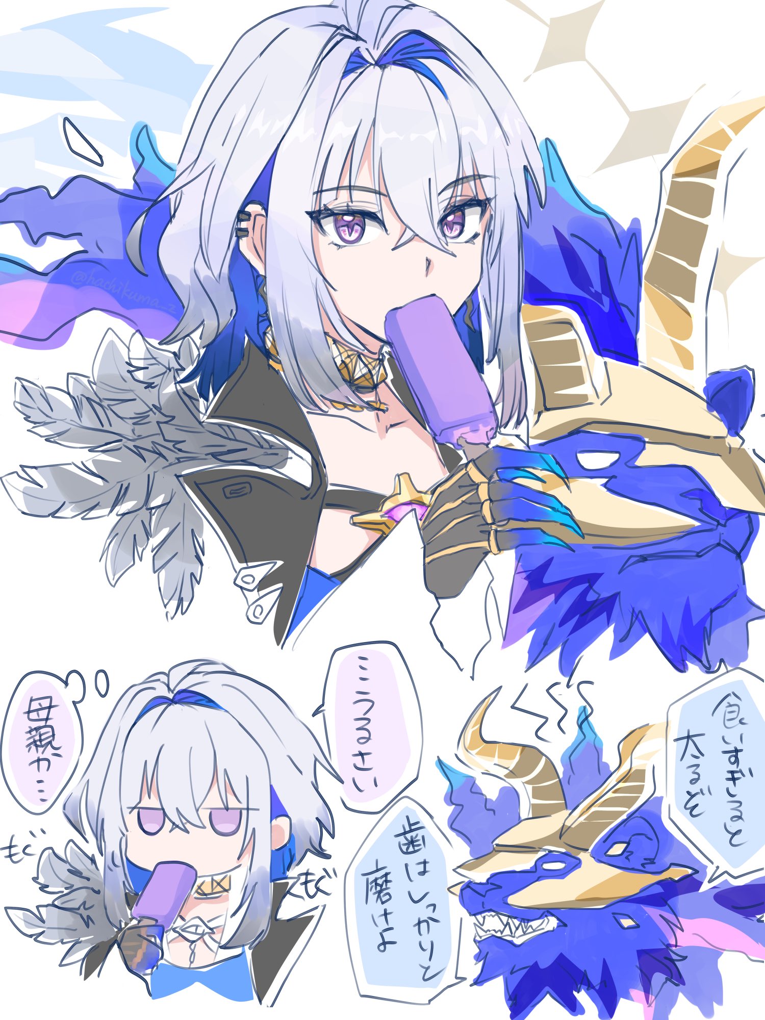 1girlblack feathersblue brablue nailsbracollarbonecropped shouldersfeathersfoodfood in mouthgold chokerhair between eyeshair intakesholdingholding foodholding popsiclemultiple viewspopsiclepopsicle in mouthpurple eyestacet discord (wuthering waves)underwearwhite background