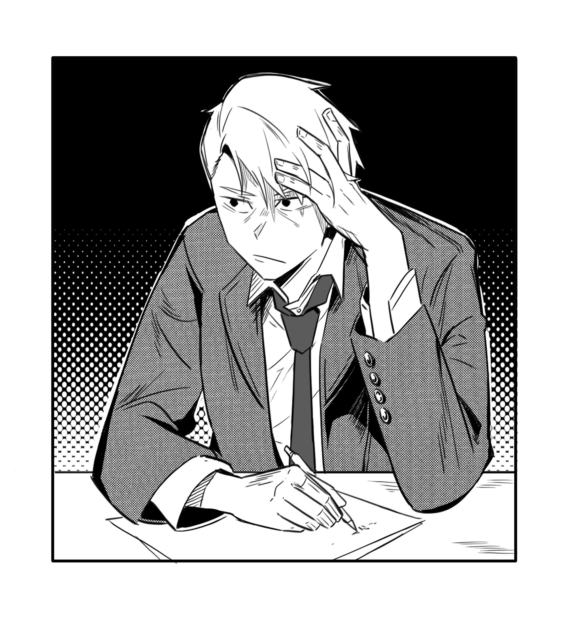 1boyborderchoppy bangsclosed mouthcollared shirtgreyscalehair between eyeshand on own headholdingholding penjacketlong sleeveslooking to the sidemale focusmonochromenecktieopen clothesopen jacketpaperpenshirtshort hairsolothinkingwhite borderwriting