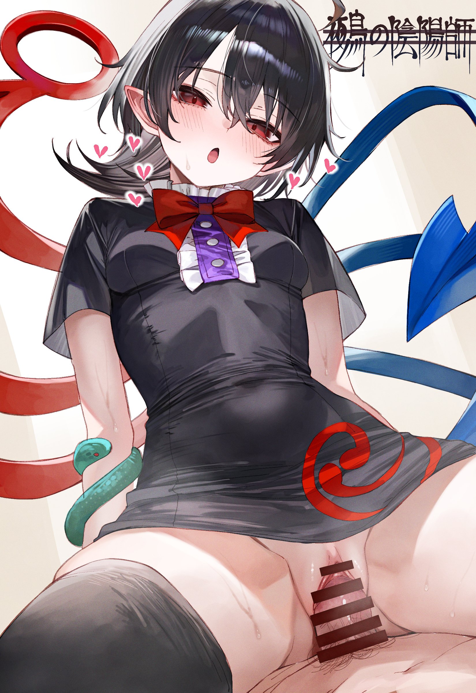 1boy1girlasymmetrical wingsbar censorblack dressblack hairblack thighhighsblue wingsbottomlessbowbowtiebreastscensoredcenter frillsclothed female nude malecovered navelcowgirl positiondressfrillsgirl on topmale pubic hairmedium hairno pantiesnudeopen mouthpointy earspovpubic hairred bowred bowtiered eyesred wingssexshort sleevessmall breastsstraddlingsweatthighhighswings