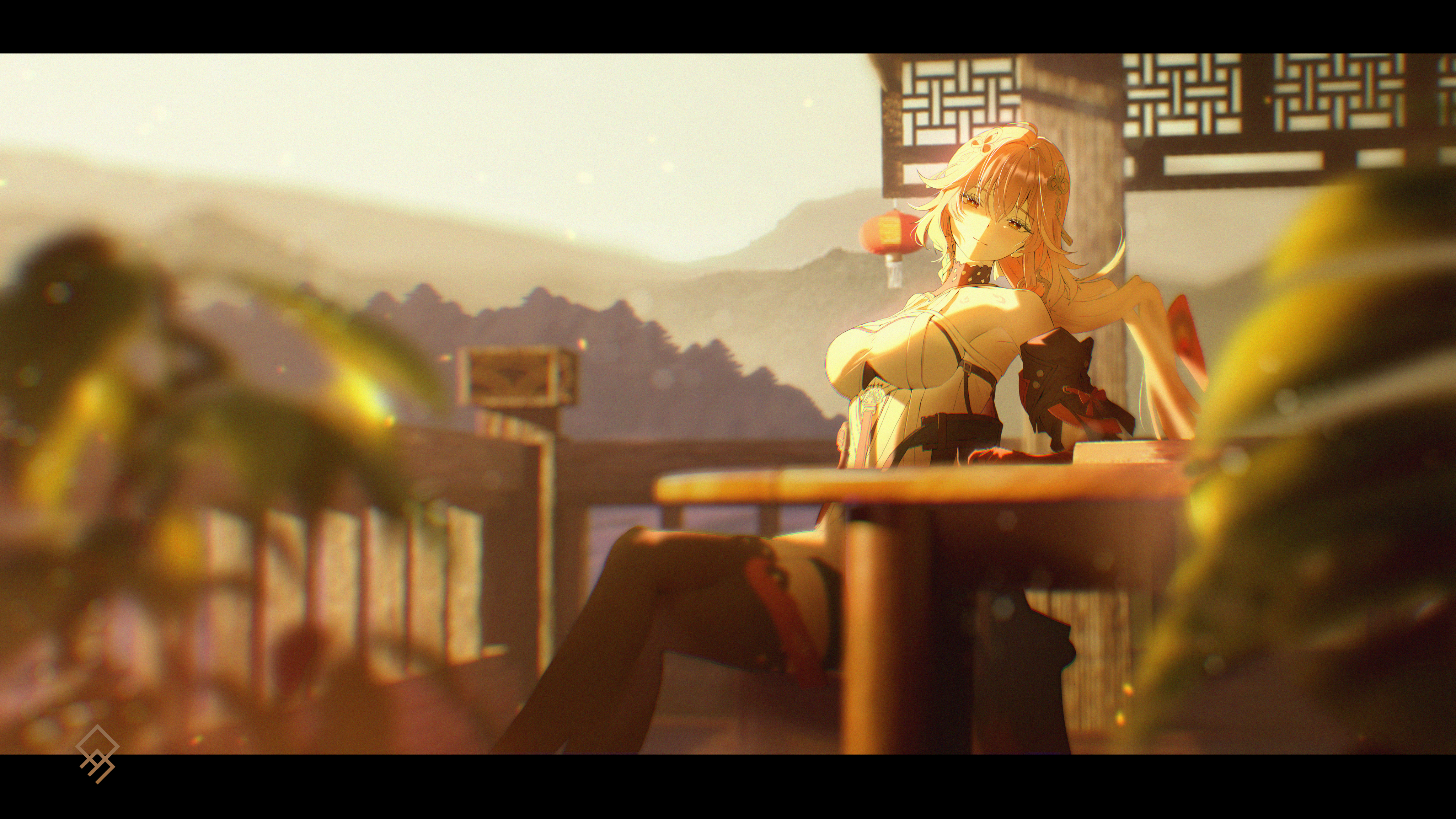 1girlartist logobare shouldersblack collarblack jacketblack thighhighsblurryblurry foregroundbody markingsbreastsclosed mouthcollarcrossed legsdawndetached sleevesdressfeather hairhair between eyesjacketlarge breastsletterboxedlogolong hairlooking at viewermulticolored hairorange eyesoutdoorspink hairsittingsmilesolothighhighsthighstwo-tone hairwhite dresswhite hair