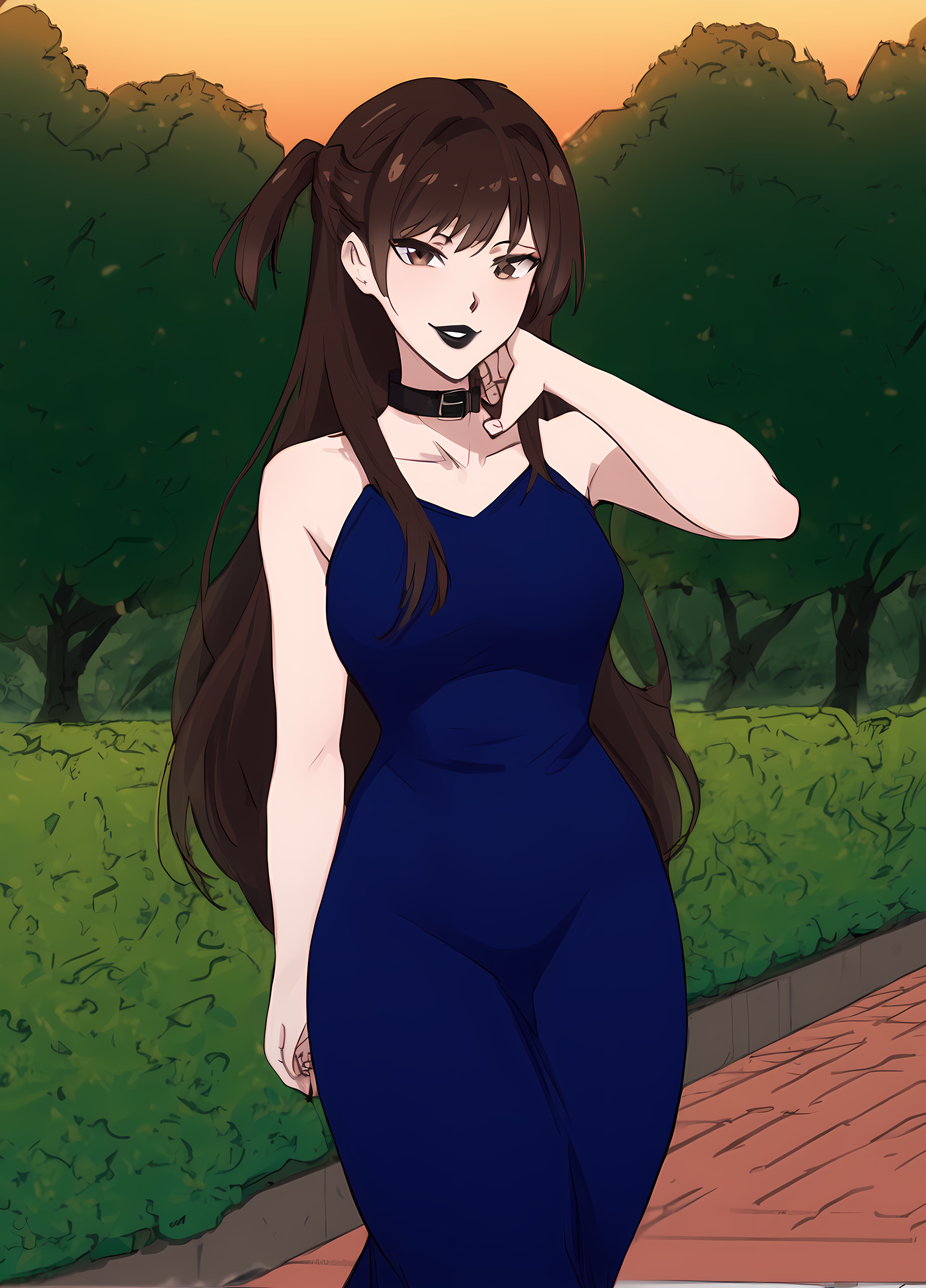 afternoonai generatedarmless dressbangsbeautiful girlbig breastsblack collarblack lipstickblack stockingsblue dressbrown eyesbrown haircollarboneelegant dressfemaleFlag for Deletionfrom above outsidehentaihourglass figurekanojo okarishimasulong dresslong hairlooking at viewermedium breastsmizuhara chizuruone side uppale skinparkpixel dream genseductiveserious expressionsexyslight smilesunsetthick thighsuncensored