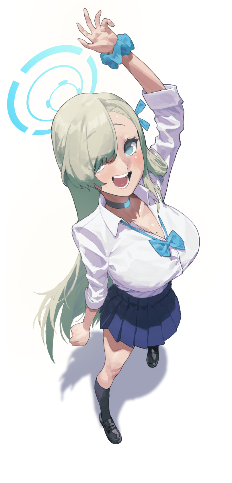 1girlblack shoesblonde hairblue eyesblue haloblue skirtbreastschokercleavagecollarbonefull bodyhair over one eyehair ribbonhalolarge breastslong hairlooking at viewermolemole on breastopen mouthpleated skirtribbonscrunchieshirtshoesskirtsleeves rolled upsmilesolothighsvery long hairwavingwhite backgroundwhite shirtwrist scrunchie