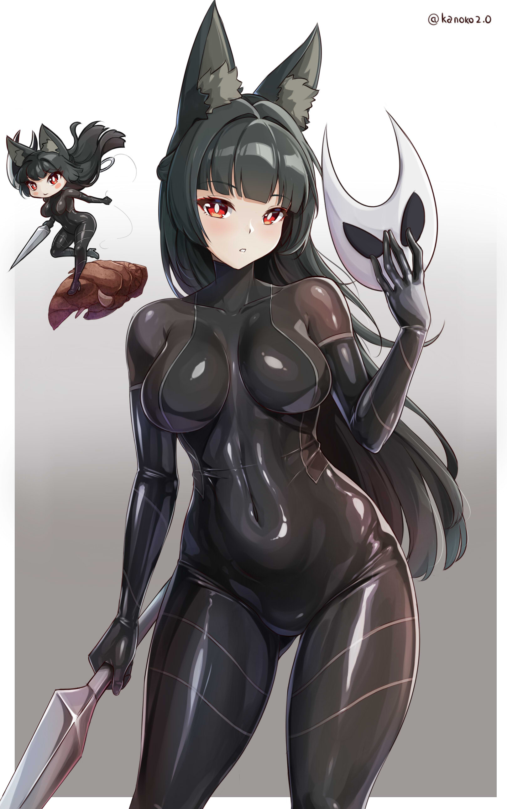 1girlalternate costumeanimal ear fluffanimal earsblack bodysuitblack hairbodysuitbreastsbright pupilschibiclosed mouthcosplayfox earsfox girlhornet (hollow knight) (cosplay)long hairlooking at viewermedium breastsred eyessolowhite backgroundwhite pupils
