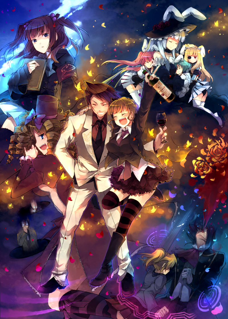 sakura (medilore), medicine melancholy, rozen maiden, touhou, lowres, 00s, 1girl, blonde hair, bow, closed eyes, female focus, flower, hair bow, letterboxed, lily of the valley, puffy sleeves, purple background, ribbon, short hair, sleeping, solo