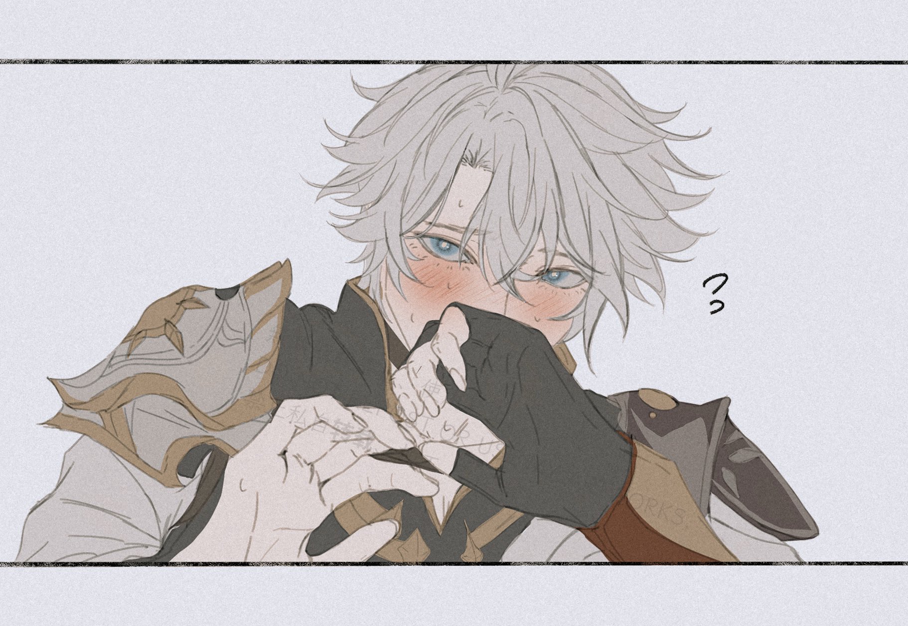 1boyantenna hairarmorartist nameblack chokerblack glovesblue eyesblushborderchokercovering own mouthfingerless glovesfingernailsflying sweatdropsglovesgrey hairhair between eyeshands upjacketlong sleevesmale focusshort hairshoulder armorshysimple backgroundsingle glovesolosun symbolsweatupper bodywhite backgroundwhite borderwhite jackety9iii1