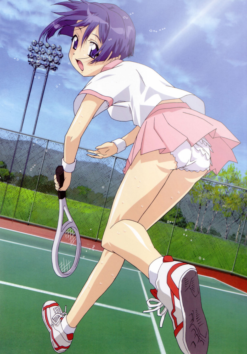 1girlblue eyesblue hairfemale focusfrilled pantiesfrillslooking backmatching hair/eyespantiespantyshotracketshort hairskirtsolosweattennistennis racketunderwear
