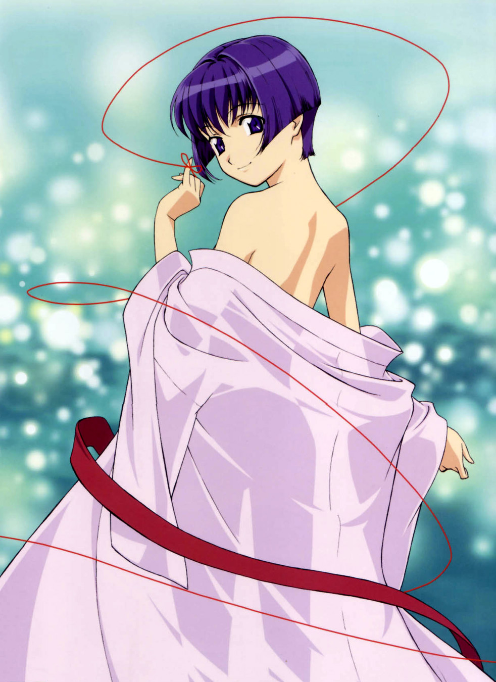 backbare shouldersblue eyesblue hairjapanese clotheslooking backshort hairsolostringstring of fateundressing