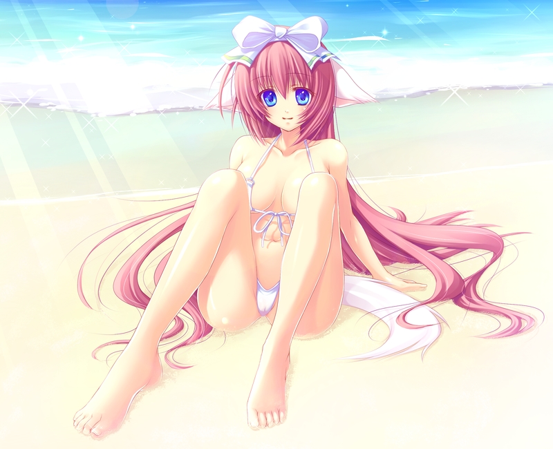 animal earsbarefootbeachbikiniblue eyescat earscat taildayfeetlong hairpink hairsolospread legsswimsuittail