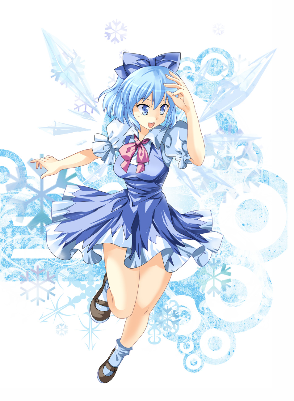 1girlaged upblue eyesblue hairdressfemale focusmary janesmatching hair/eyesopen mouthshoesshort hairsmilesnowflakessockssolowings