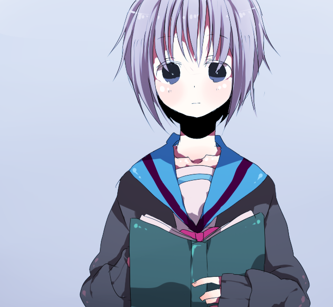 00s1boy1girlblue backgroundblue eyesblushbookbowcardiganclosed mouthcollarbonefemale focusholdingholding booklong sleeveslooking at vieweropen bookopen cardiganopen clothespink bowpurple hairschool uniformserafukushort hairsimple backgroundsoloupper body