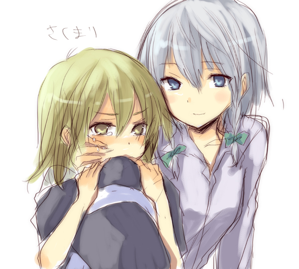 2girlsblonde hairblue eyesbraiddress shirtfemale focushand on another's facehatholdingholding unworn hatmultiple girlsribbonshirtshort hairsmiletearstwin braidsunworn hatunworn headwearwitchwitch hatyellow eyes