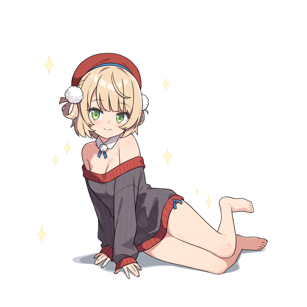 1girlarm supportbare shouldersbarefootberetbreastsbrown haircleavageclosed mouthcollardetached collarfull bodygreen eyesgrey shirthatlong sleeveslooking at viewermedium breastsoff shoulderoff-shoulder shirtpinstripe patternpinstripe shirtpuffy long sleevespuffy sleevesred hatshadowshirtsimple backgroundsleeves past wristssmilesolosparklevirtual youtuberwhite backgroundwhite collar
