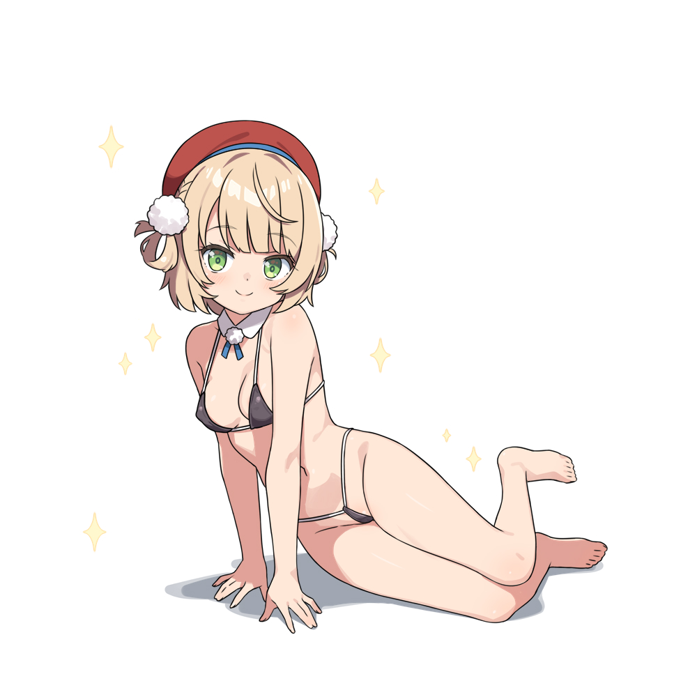 1girlarm supportbare armsbare legsbare shouldersbarefootberetbikiniblack bikinibreastsbrown hairclosed mouthcollardetached collarfull bodygreen eyesgroinhatlooking at viewermedium breastsnavelred hatshadowsimple backgroundsmilesolosparkleswimsuitvirtual youtuberwhite backgroundwhite collar