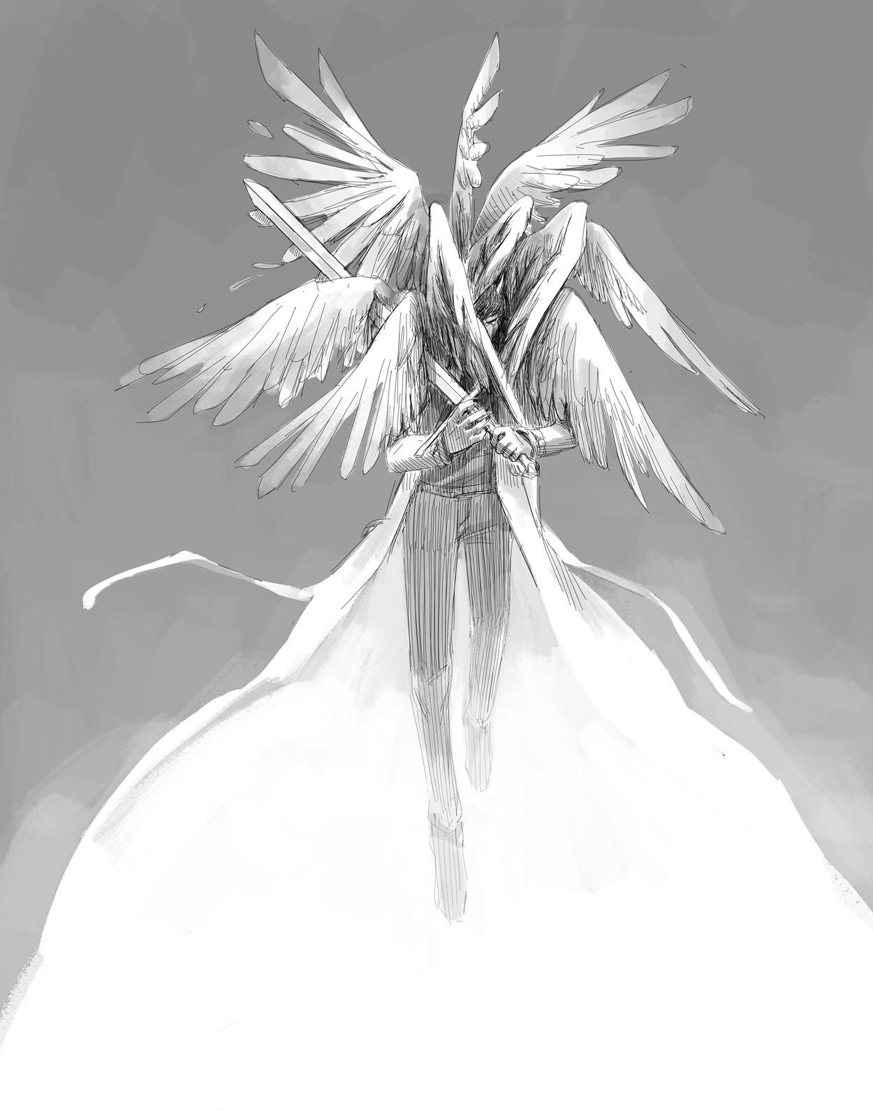 1otherblack pantsblack shirtcensoredcensored identitycoatfacing viewerfeathered wingsfull bodygreyscaleholdingholding swordholding weaponmonochromeopen clothesopen coatpantsshirtsoloswordtangerinegodtoo many wingswalking towards viewerweaponwhite coatwhite wingswings
