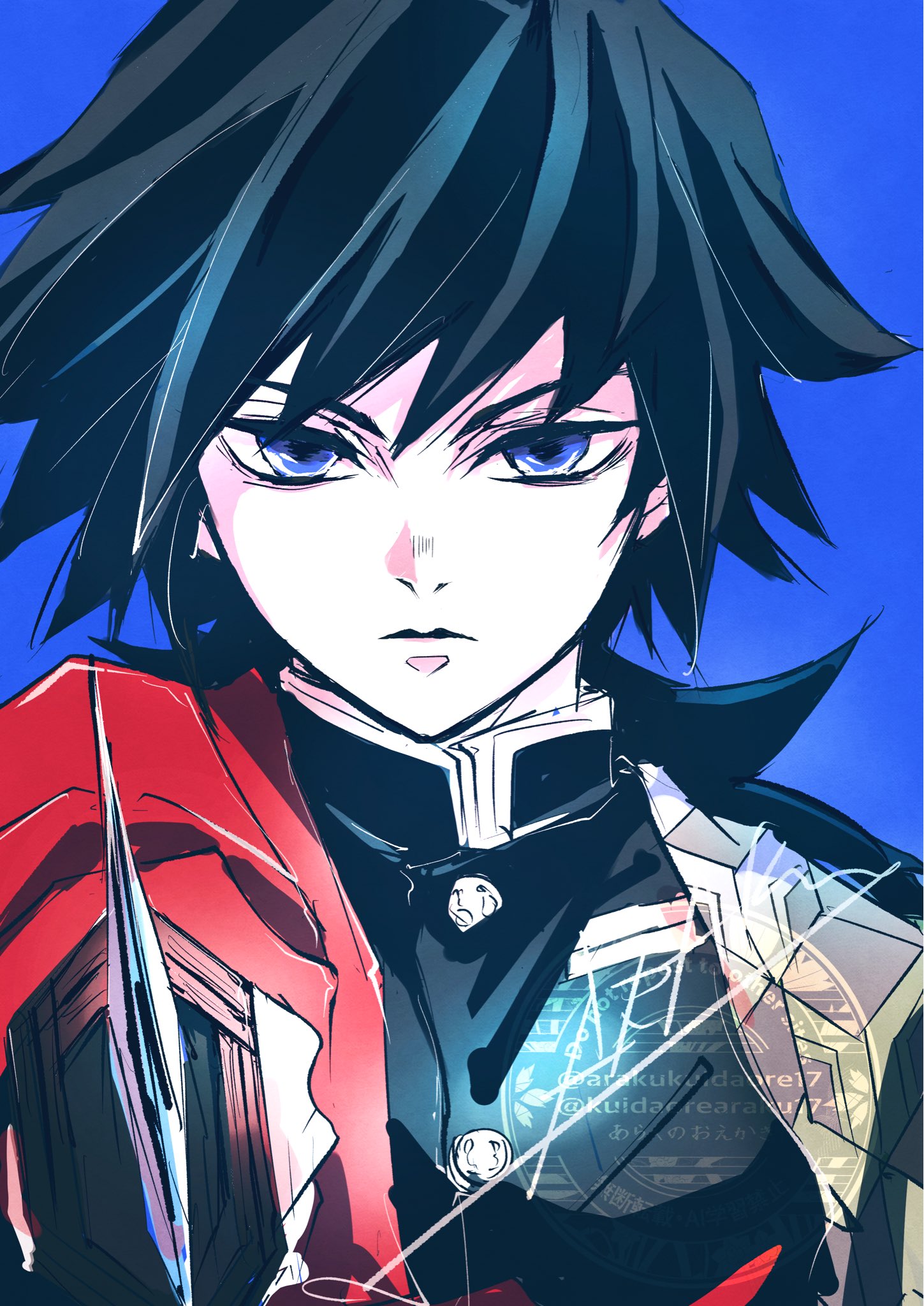 1boyblack hairblack jacketblue backgroundblue eyesclosed mouthdemon slayer uniformhaorihigh collarholdingholding swordholding weaponjacketjapanese clotheskatanakikkoumonkuidaorearakulooking at viewerlow ponytailmale focuspointingpointing at viewerponytailprint haorired haorisimple backgroundsolospiked hairswordupper bodywatermarkweapon