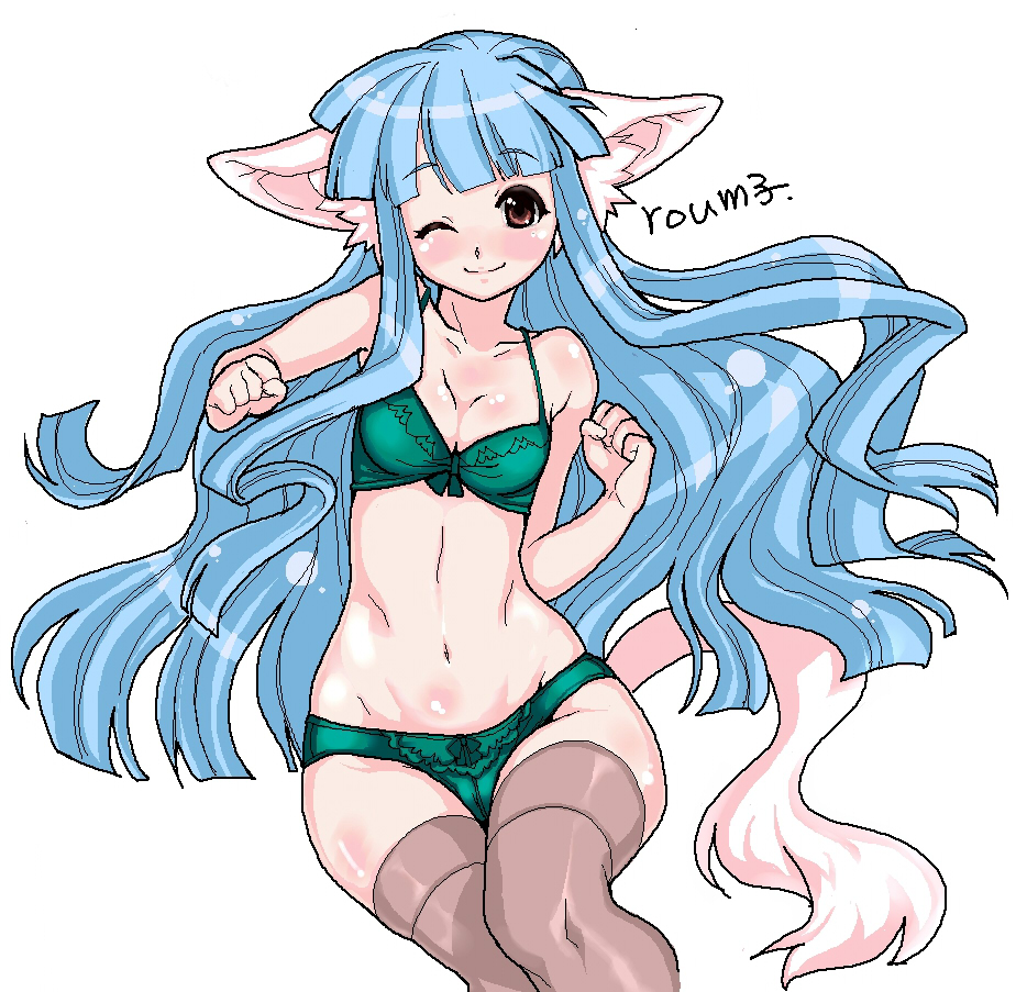 1girlanimal earsblue hairblushbody blushbrabrown eyescat earscat tailfemale focuship focuslingerielong hairnaveloekakione eye closedpantiessimple backgroundsmilesolotailthighhighsunderwearunderwear onlywide hipswink