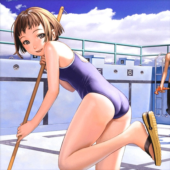 black eyesbob cutbrown haircleaningempty poolmopone-piece swimsuitpoolsandalsschool swimsuitshort hairswimsuit