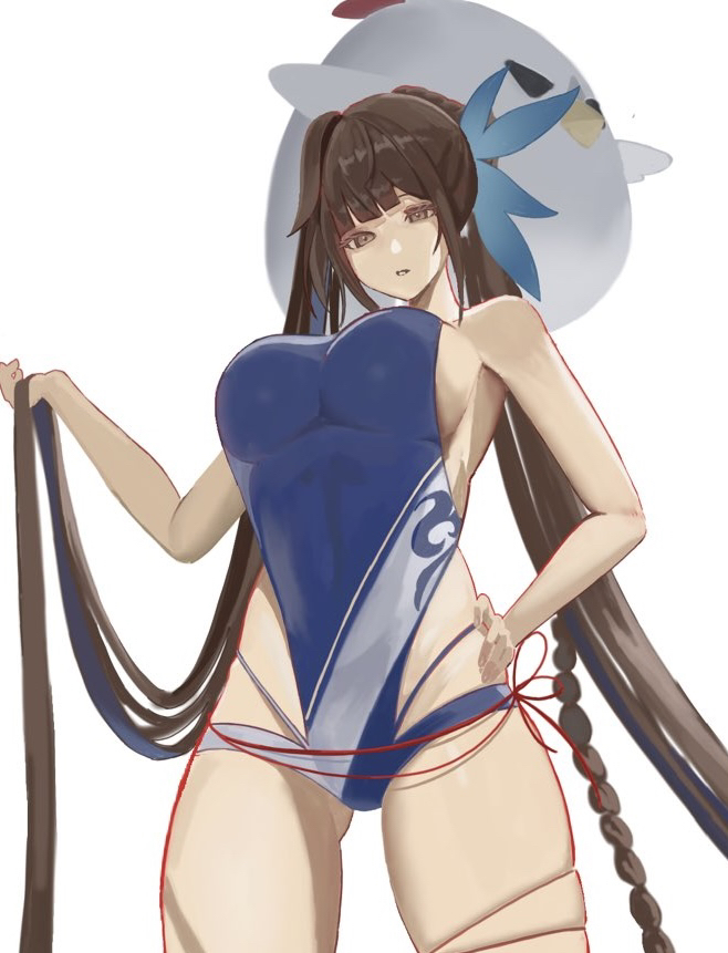 michael, xp-tan, os-tan, visor, 1girl, bikini, bikini pull, black hair, blue eyes, breasts, cleavage, day, hair ribbon, large breasts, long hair, ocean, open mouth, outdoors, ponytail, ribbon, side-tie bikini bottom, smile, solo, string bikini, swimsuit, untying, visor cap, water