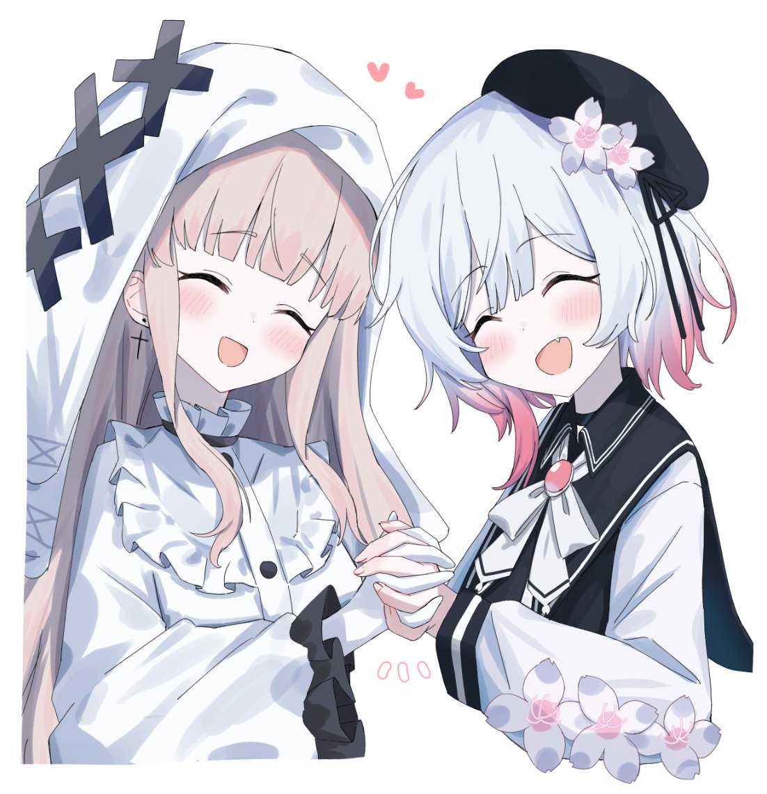 :d1boy2girlsblushclosed eyescrosscross earringsdressearringsfangflowerfrillsgloveshair flowerhair ornamenthatheartholding handsinterlocked fingersjewelrylong hairlong sleevesmulticolored hairmultiple girlsopen mouthshirtsimple backgroundsmileupper bodyvirtual youtuberwhite backgroundwhite gloveswhite hairwhite shirt