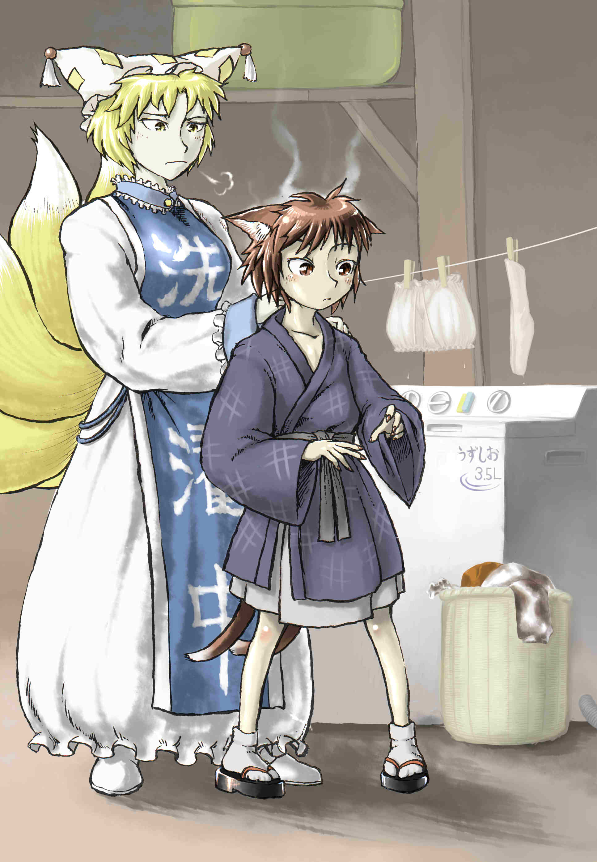 2girlsalternate costumeanimal earsanimal hatblonde hairbrown eyesbrown haircat earscat girlcat tailfemale focusfox tailhatlaundrylong sleevesmob capmultiple girlsmultiple tailsno headwearsandalsshoesshort hairsockstailtasselwide sleevesyellow eyeszouri