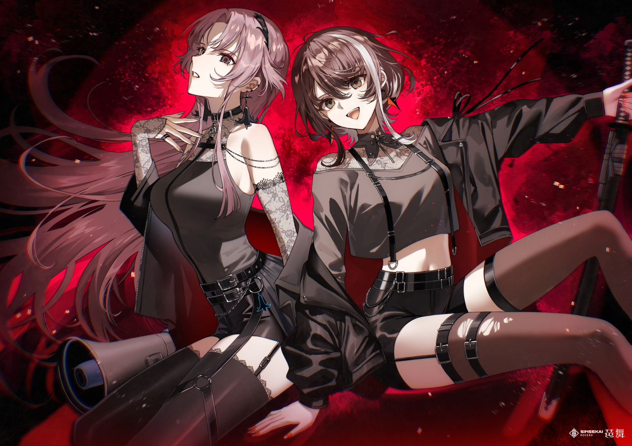 2girlsbema (sinsekai)black jacketblack shortsblack thighhighsbrown hairbrown shirtcharacter namecopyright namecropped shirtearringsgarter strapsgrey nailsholdingholding swordholding weaponjacketjewelrylacemegaphonemulticolored hairmultiple girlsnail polishopen clothesopen jacketpantyhoseparted bangspink hairred backgroundringshirtshortssittingstreaked hairswordthighhighstorn clothestorn pantyhosevirtual youtuberweaponwhite hair