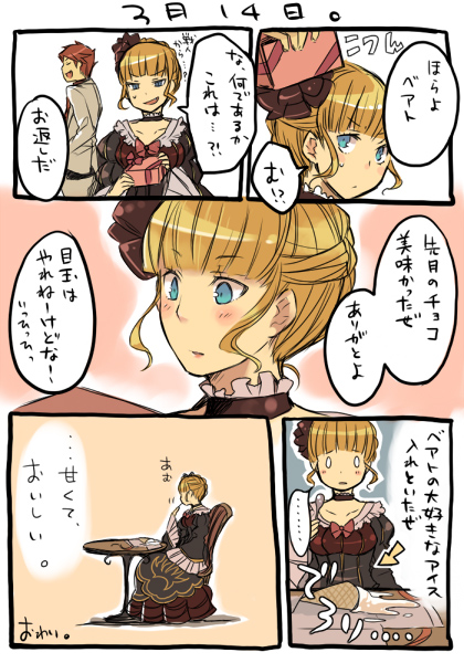 00s1boy1girlblonde hairblue eyesblushchairchokercomicdatedfoodgifthair ornamentice creamice cream coneo osittingspilltablewhite day