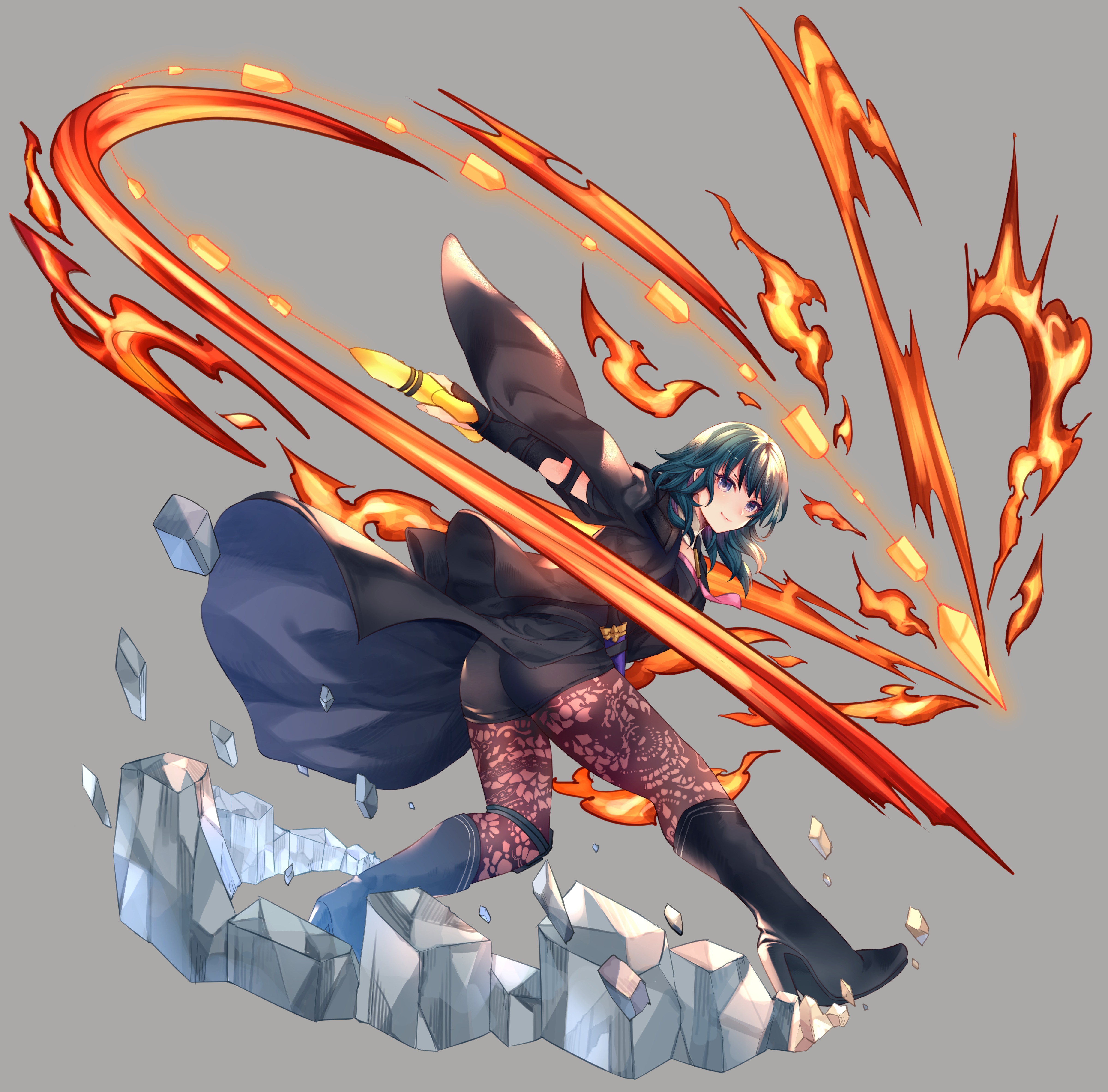 1girlassblack bootsblack shortsblue eyesblue hairbootsbreastsclosed mouthgrey backgroundhigh heel bootshigh heelsholdingholding swordholding weaponmedium breastspantyhoseshortssimple backgroundsmilesoloswordsword of the creatorweaponwhip sword