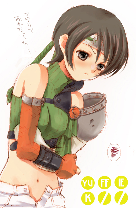 1990s (style)1girlarmorbare shouldersbrown eyesbrown hairfemale focusfingerless glovesglovesheadbandmidriffopen flyretro artstyleshort hairsimple backgroundsleevelesssleeveless turtlenecksoloturtleneckunzipped