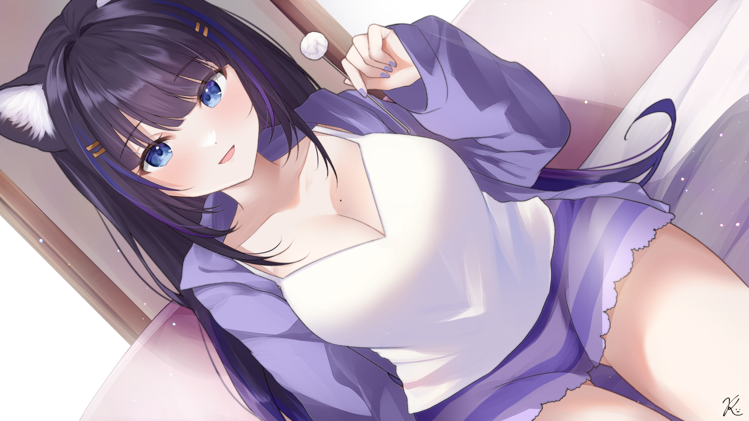 1girlanimal ear fluffanimal earsarm upbed sheetblue eyesbreastscleavagecollarbonedutch anglehair ornamenthairclipholdingindoorsjacketlarge breastslong hairlong sleeveslooking at viewermimikakimolemole on breaston bedopen clothesopen jacketopen mouthpurple hairpurple jacketpurple nailspurple shortsshirtshortssittingsleeves past wristssmilestriped clothesstriped shortsvirtual youtuberwhite shirtwolf earswolf girl