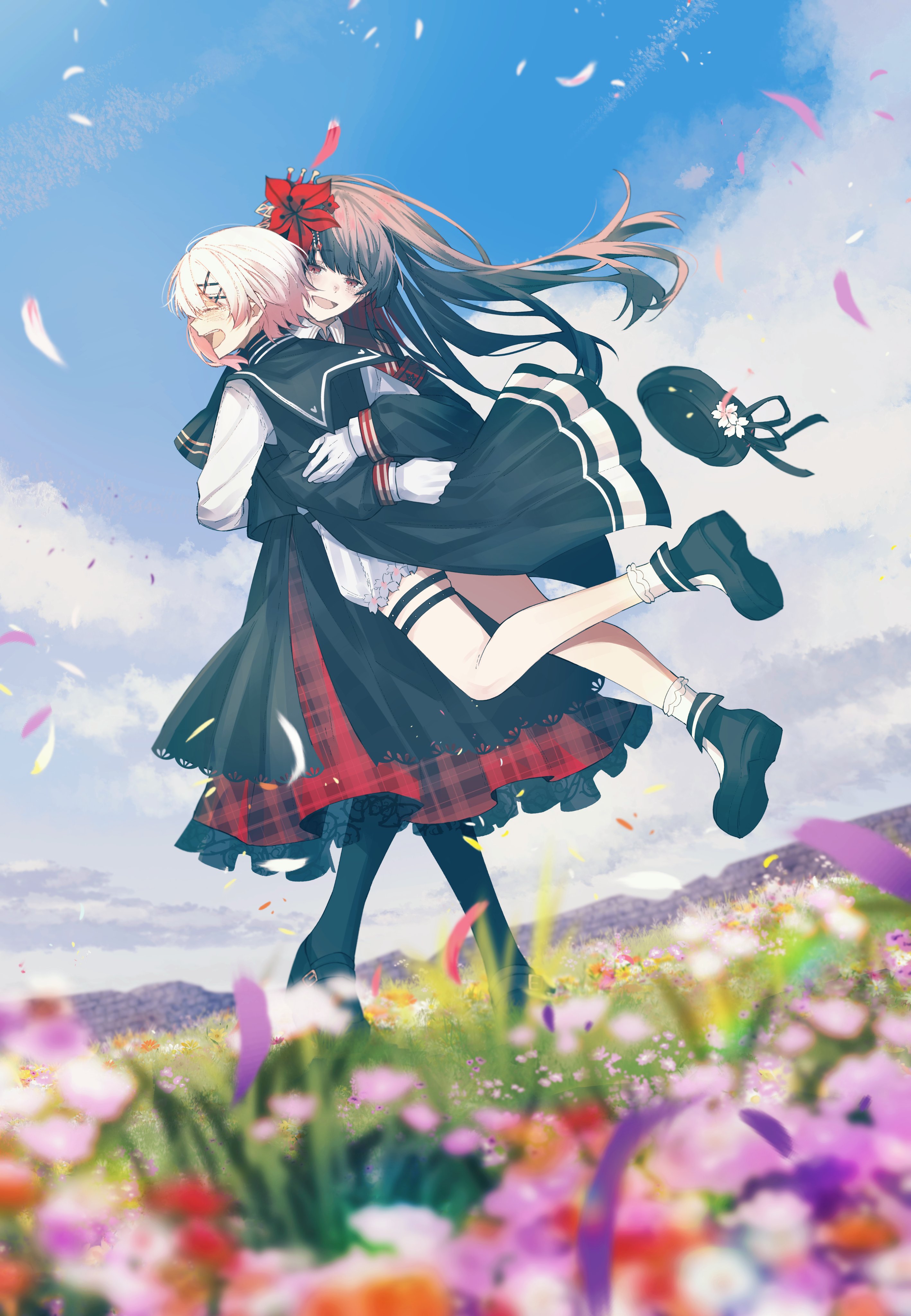 2girlsblack dressblack hairblack pantyhosebloomersbowdressfieldflowerflower fieldgloveshair bowhair ornamenthathuglong hairlong sleevesmulticolored hairmultiple girlsopen mouthoutdoorspantyhosepetalspink hairshirtshort hairskysocksthigh strapunderwearunworn headwearwhite gloveswhite shirt
