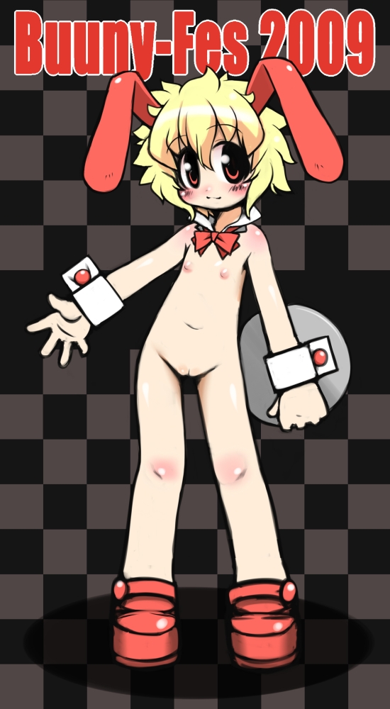 animal earsblonde hairblushbowtiebunny earscheckeredcheckered backgroundcollarfemaleFlag for Deletionflat chestfull bodynavelnipplesnudepussyred eyesshoesshort hairsmilesolostandingtraywrist cuffs