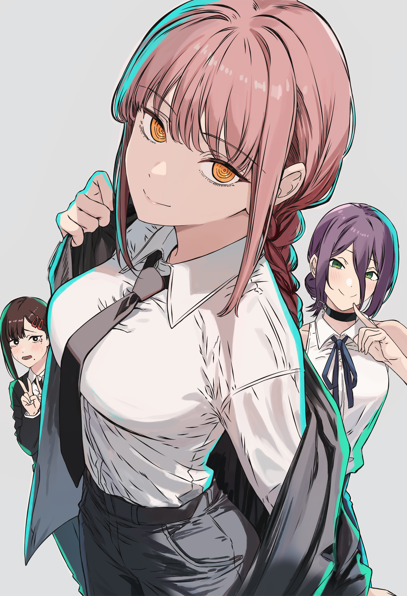 3girlsblack chokerblack necktieblack ribbonblushbraidbreastsbrown hairchokerclosed mouthcollared shirtgreen eyesgrey backgroundhair between eyesjacketlarge breastslong hairlong sleeveslooking at viewermultiple girlsneck ribbonnecktieoff shoulderopen clothesopen jacketopen mouthpink hairpurple hairred backgroundred jacketribbonshirtsidelockssimple backgroundsingle braidsleevelesssleeveless shirtsmileupper bodywhite shirtyellow eyes