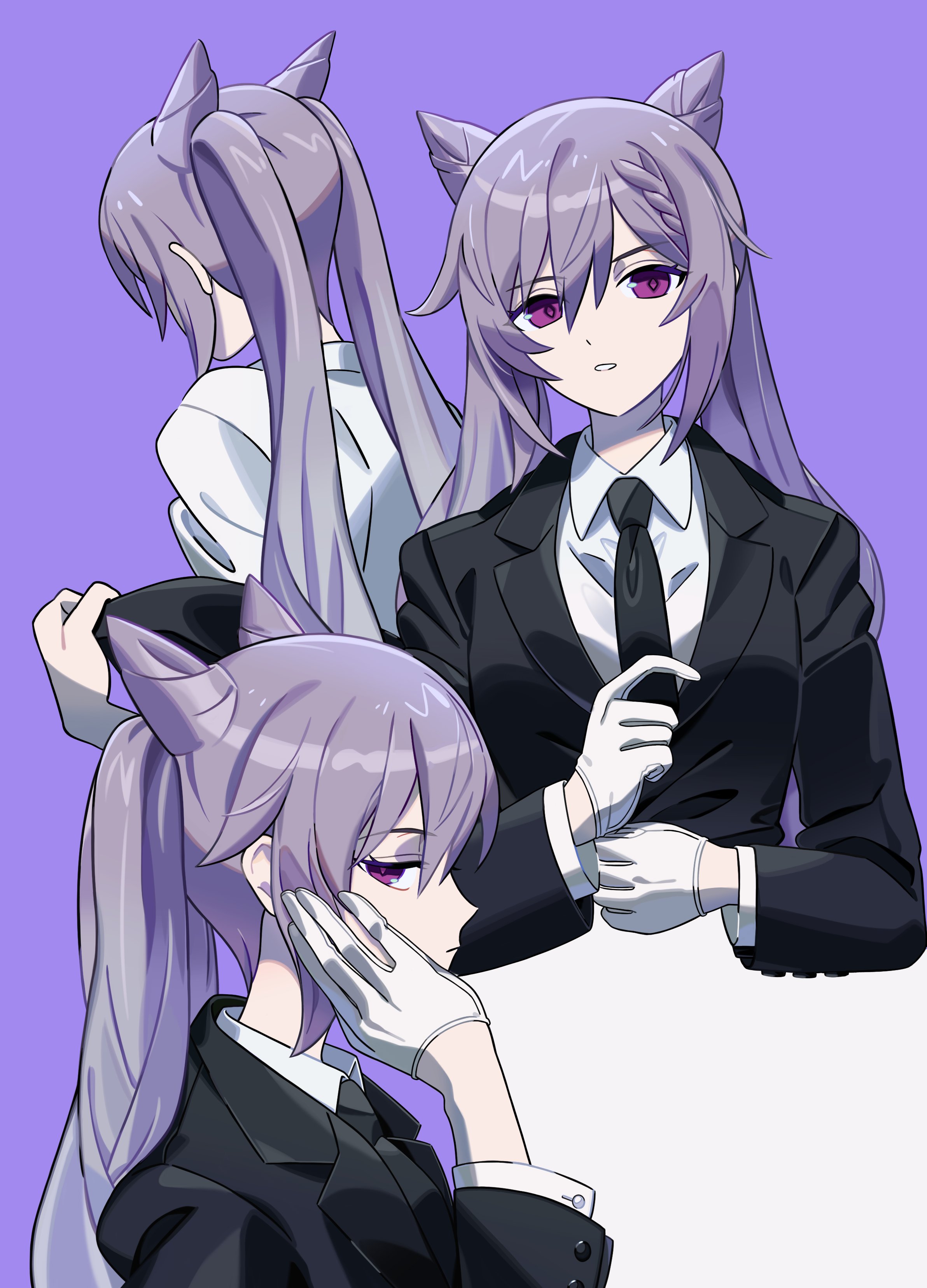 1girlalternate costumeblack jacketblack necktiebraidbuttonsclosed mouthcollared shirtcone hair bundiamond (shape)diamond-shaped pupilsformal clothesfrom behindgloveshair between eyeshair bunhalf-closed eyeshand upjacketlapelslong hairlong sleeveslooking at viewermultiple viewsnecktiepurple backgroundpurple eyespurple hairshirtsidelockssimple backgroundsuitsuit jacketsymbol-shaped pupilsteethtwintailswhite gloveswhite shirt