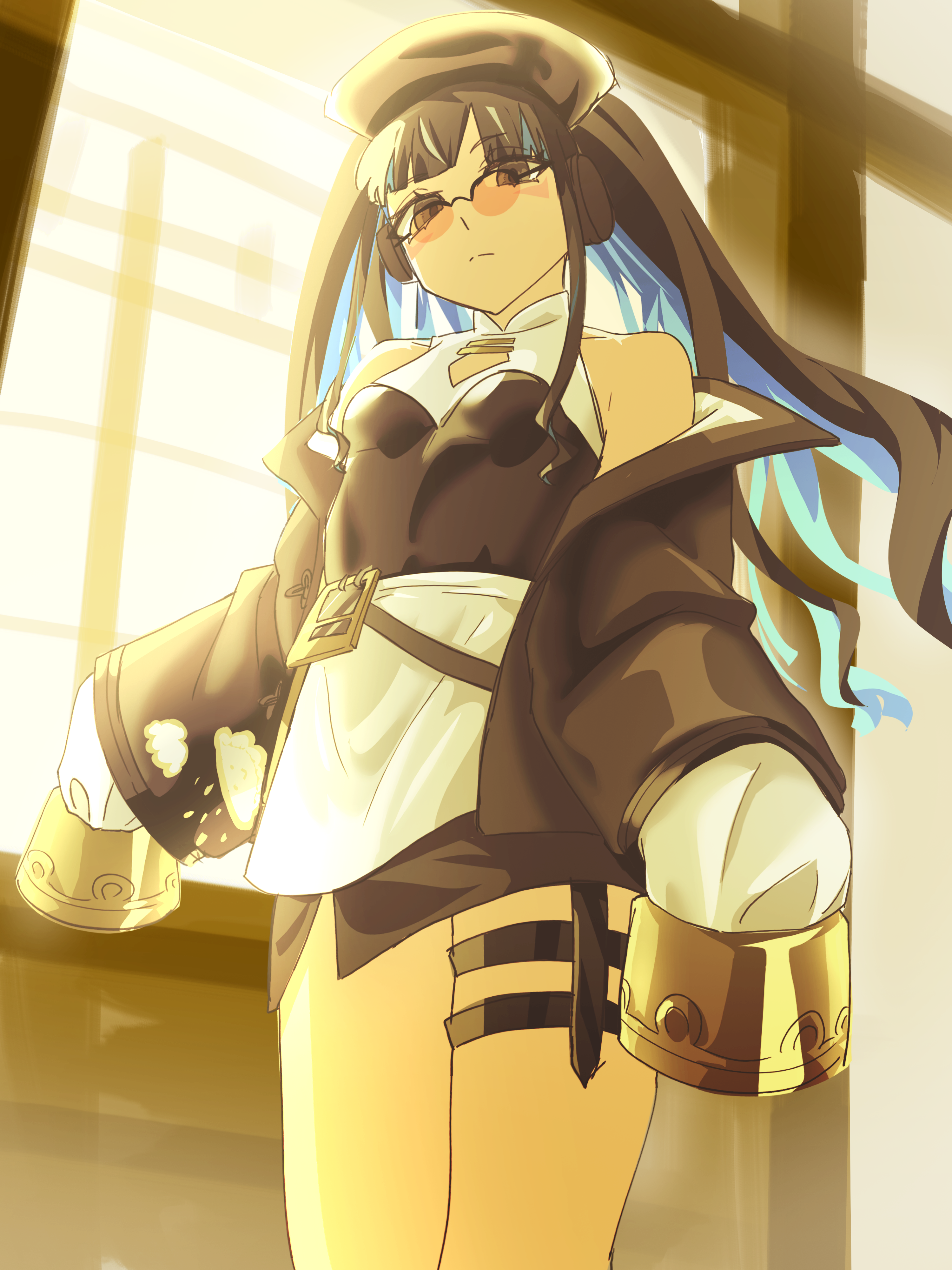 1girlblack hairblack hatblue hairbreastscolored inner haireyelinergrey eyeshatlong hairlooking at viewermakeupmulticolored hairround eyewearsidelockssmall breastssolosunglassesthighswindow