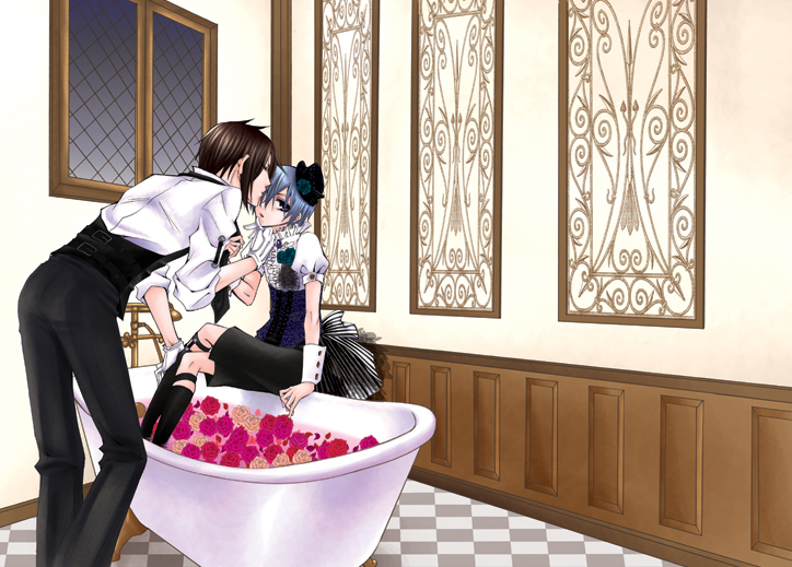 00sbathtubblack hairblue eyesblue haircorsetflowergloveshatkneehighsmale focusnecktieroseshort hairsockssuspendersyaoi