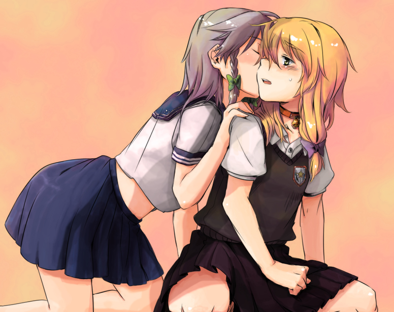 2girlsalternate costumebellblonde hairblushcontemporaryfemale focuskissmultiple girlsribbonschool uniformshort hairyuri